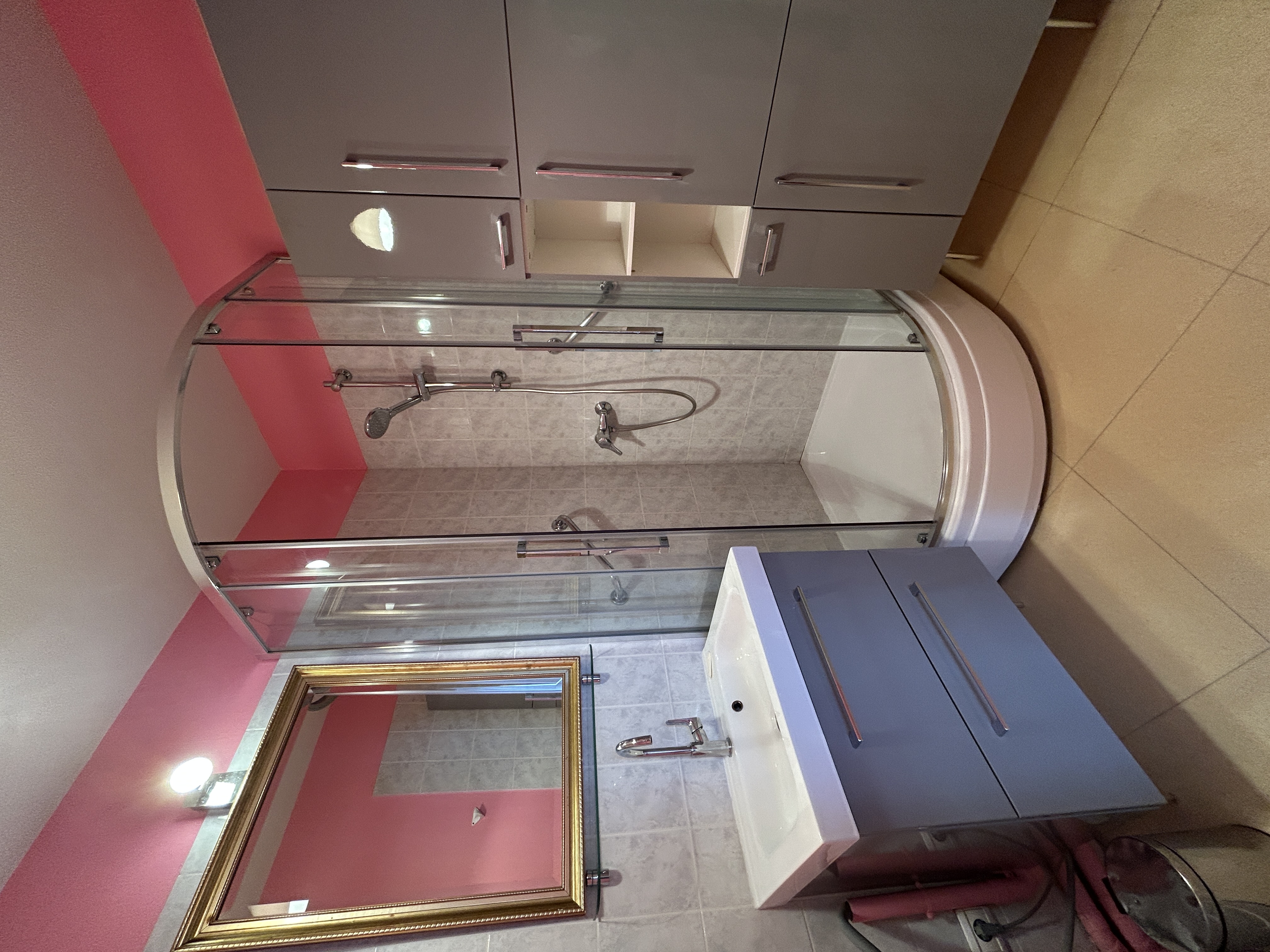 -Salle d’eau avec douche-cabine, vasque sur meuble, lave-linge et WC séparé.