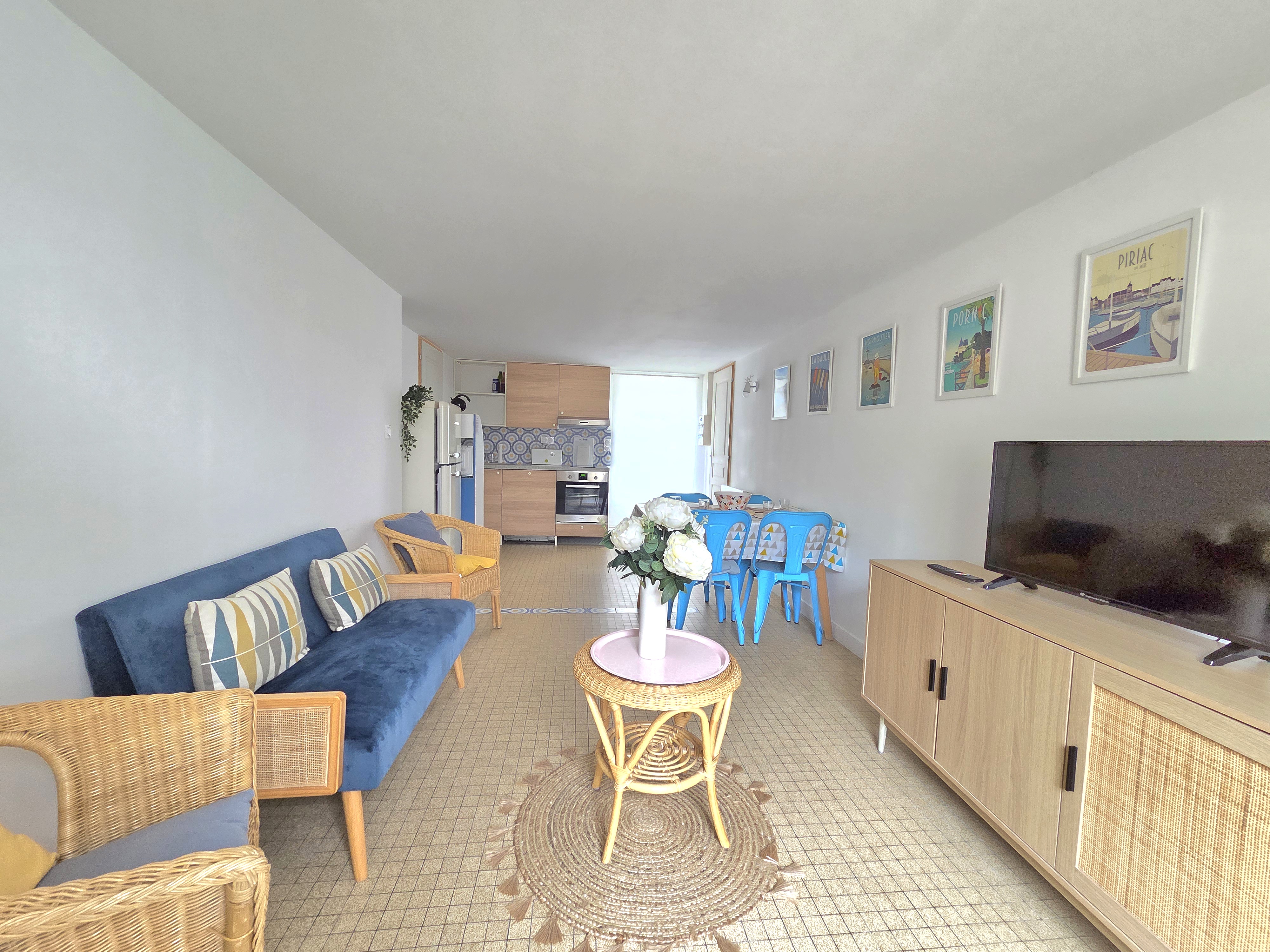 -Pièce de vie lumineuse avec espace repas et salon convivial.