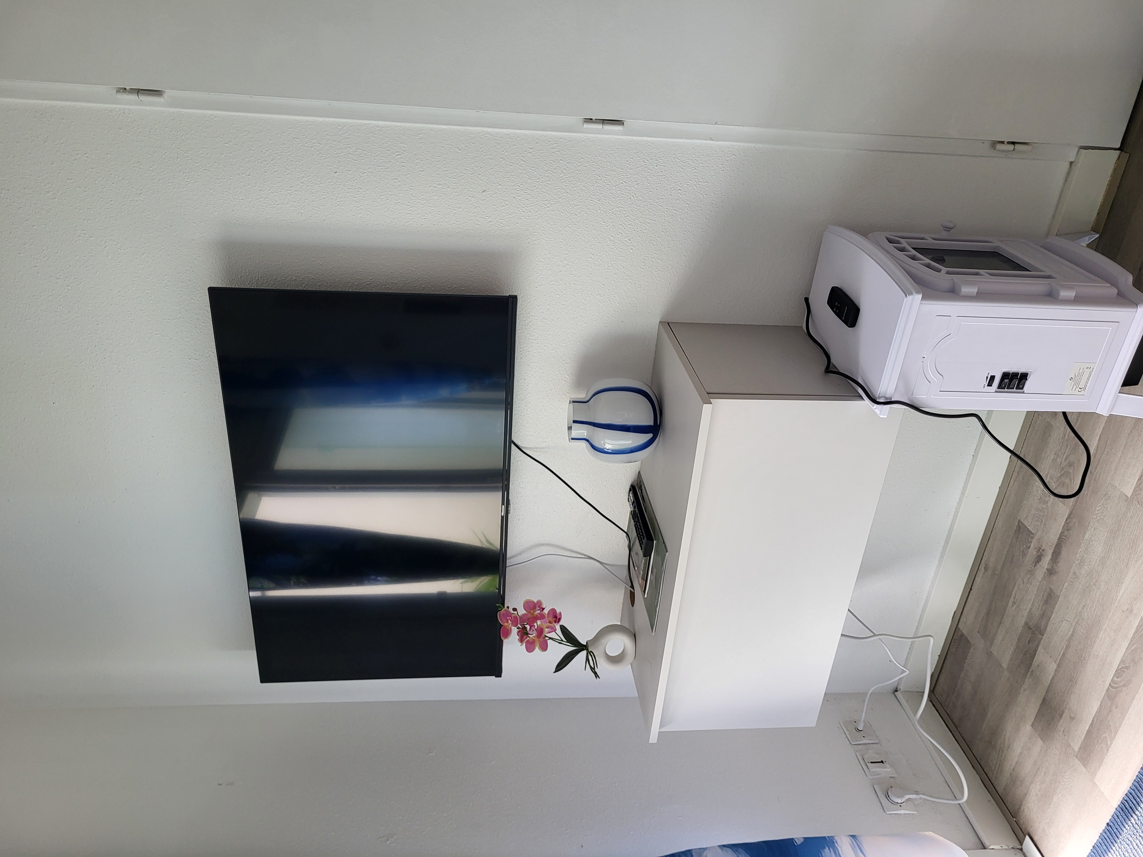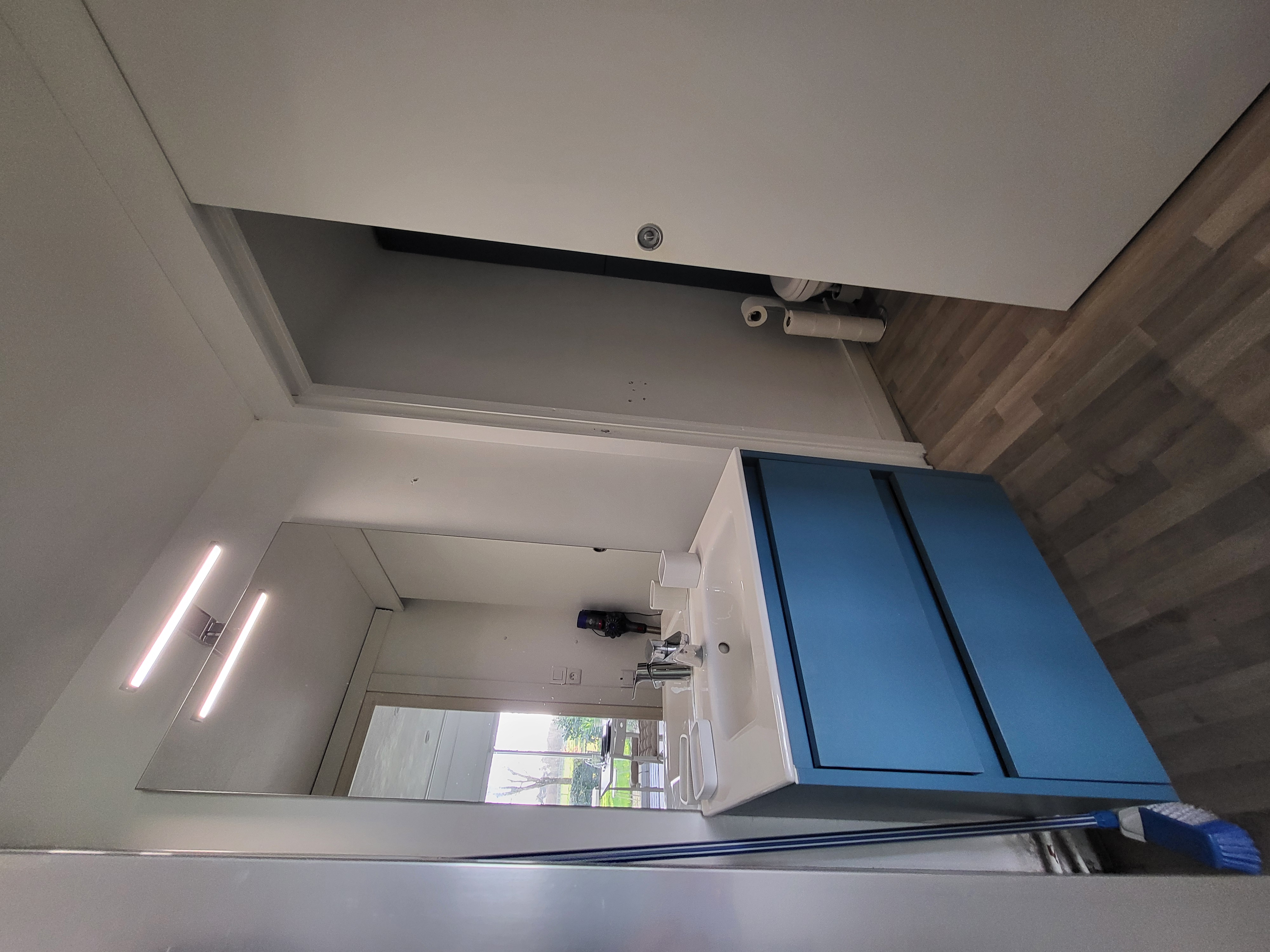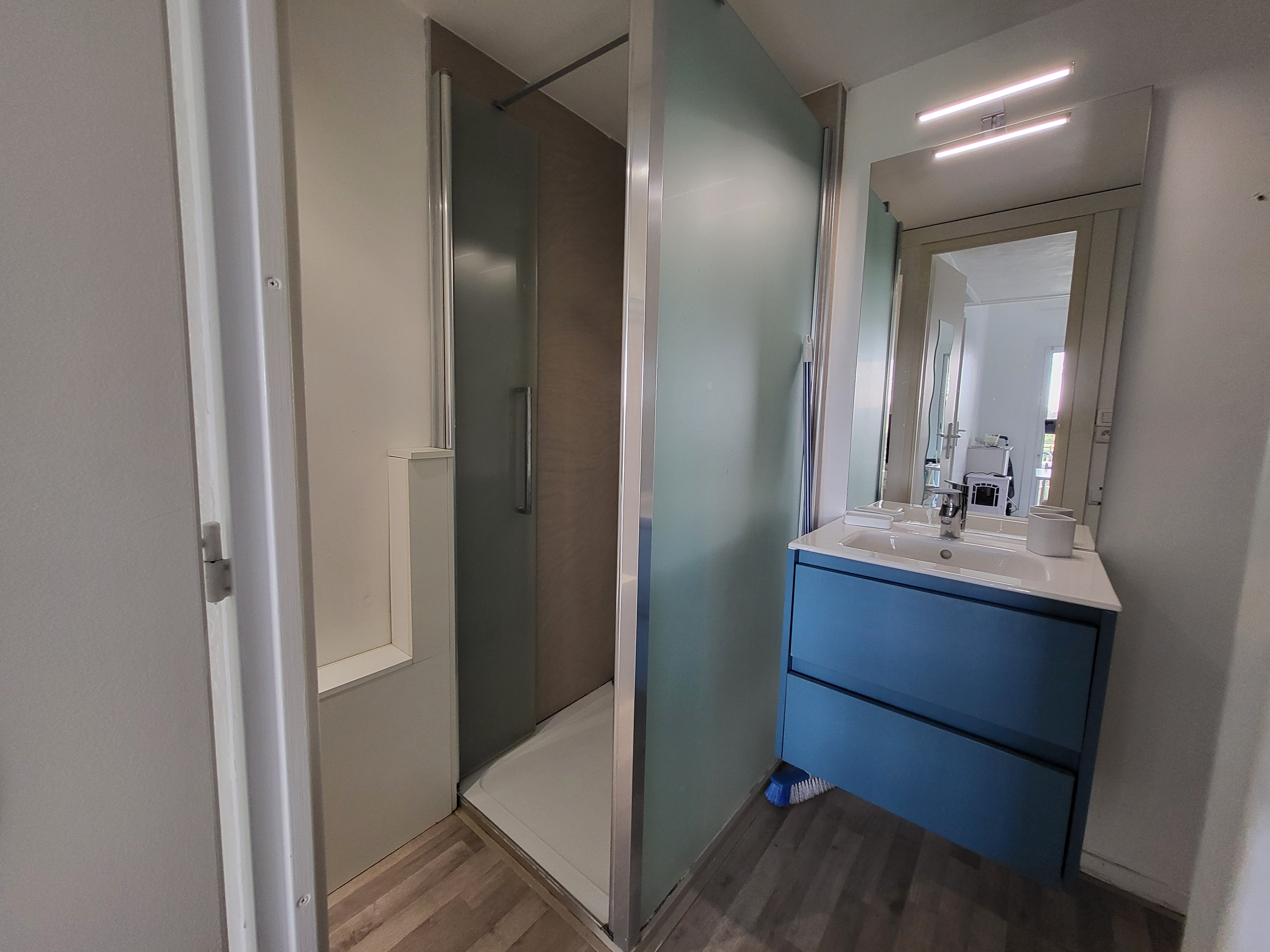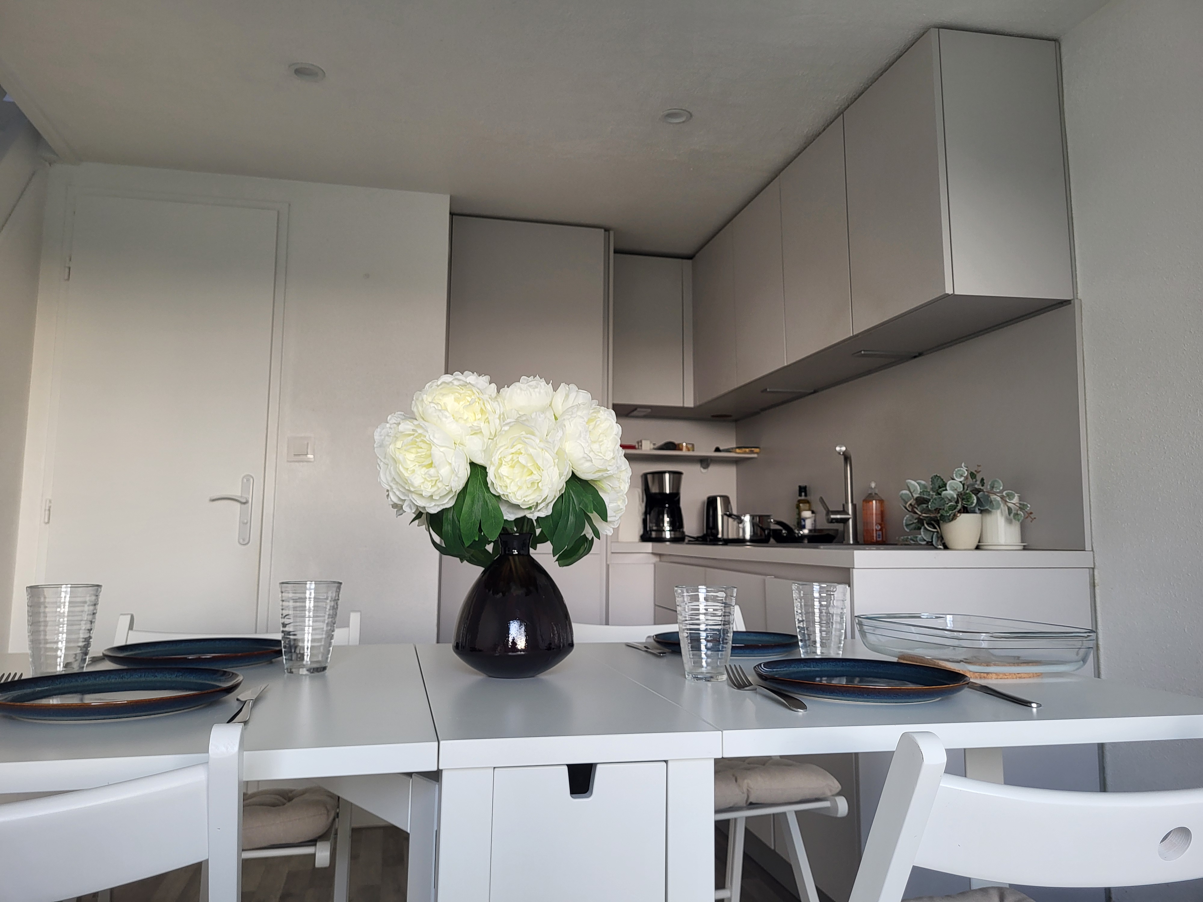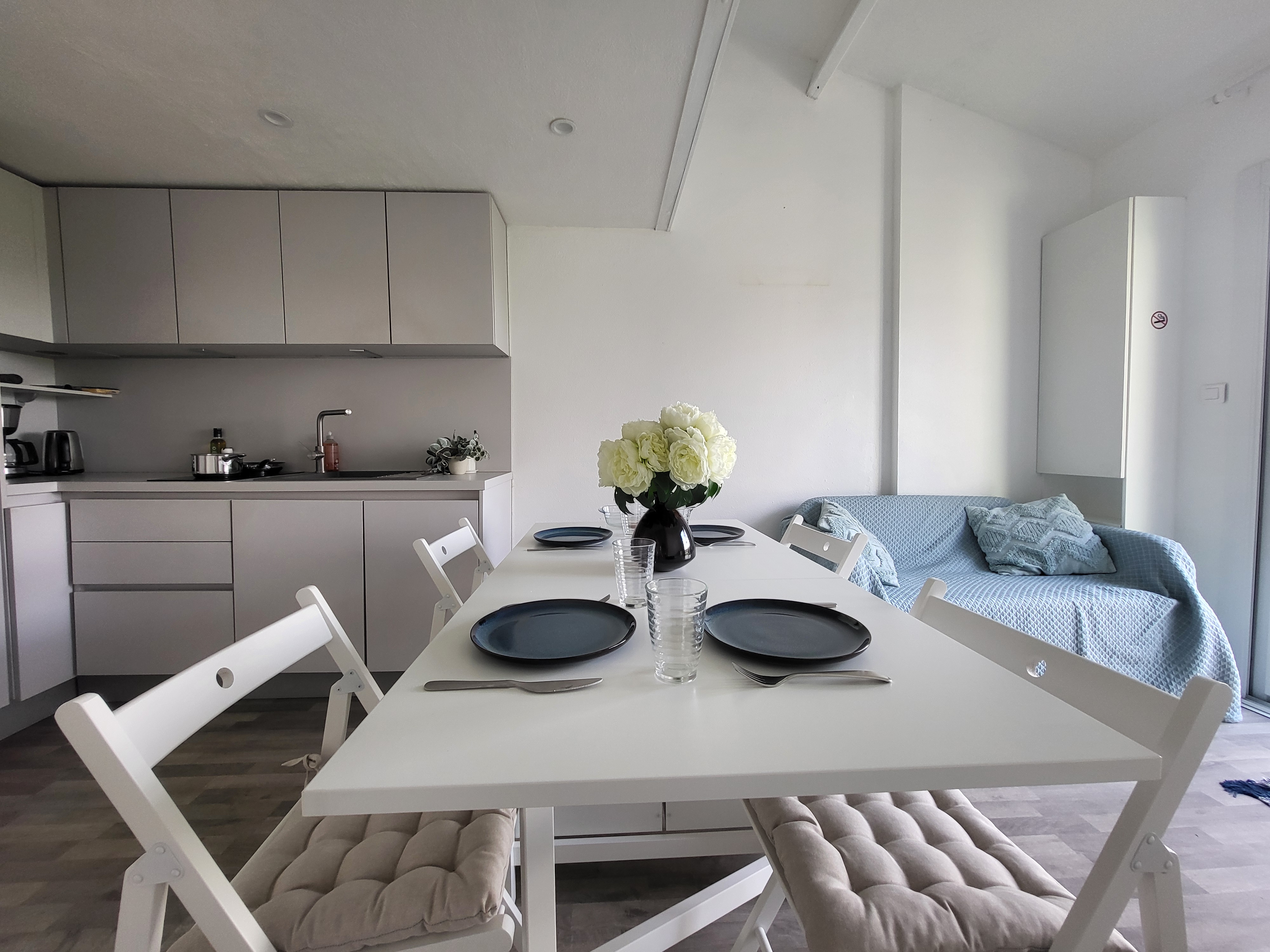 d’une chambre avec lit double (140x190), d’une salle d’eau moderne avec WC et lave-linge, d’une cuisine entièrement aménagée et équipée pour cuisiner en toute autonomie.