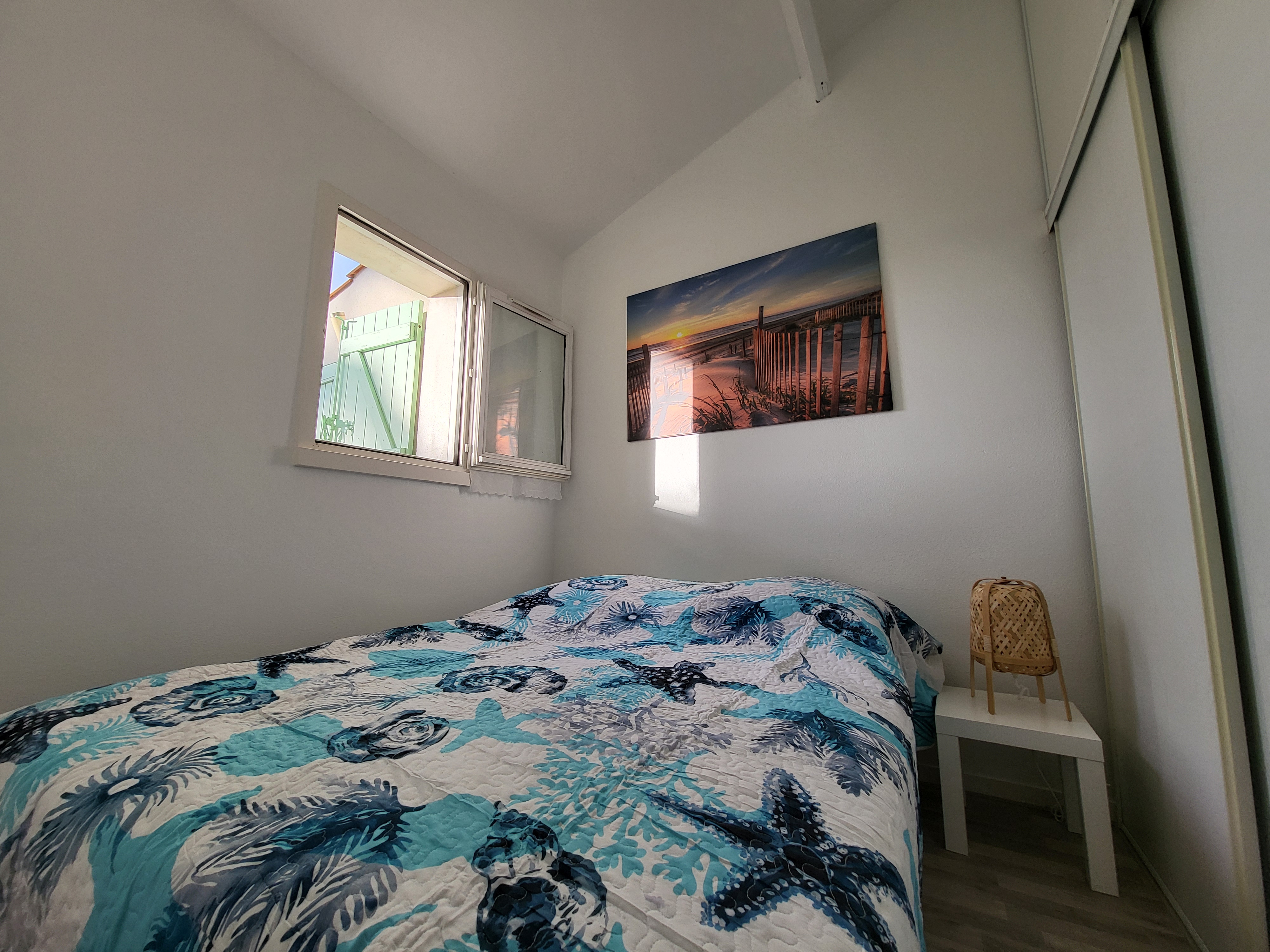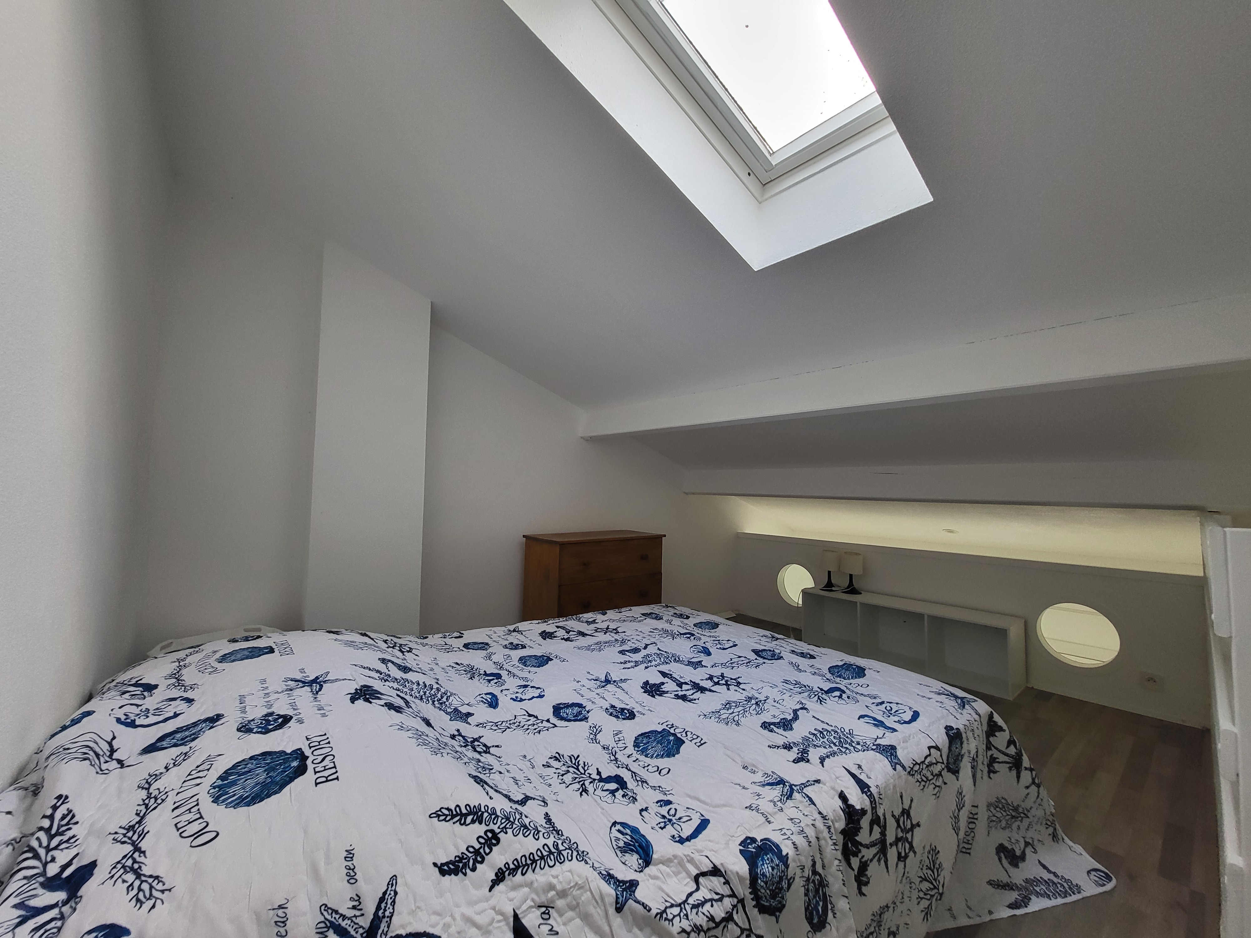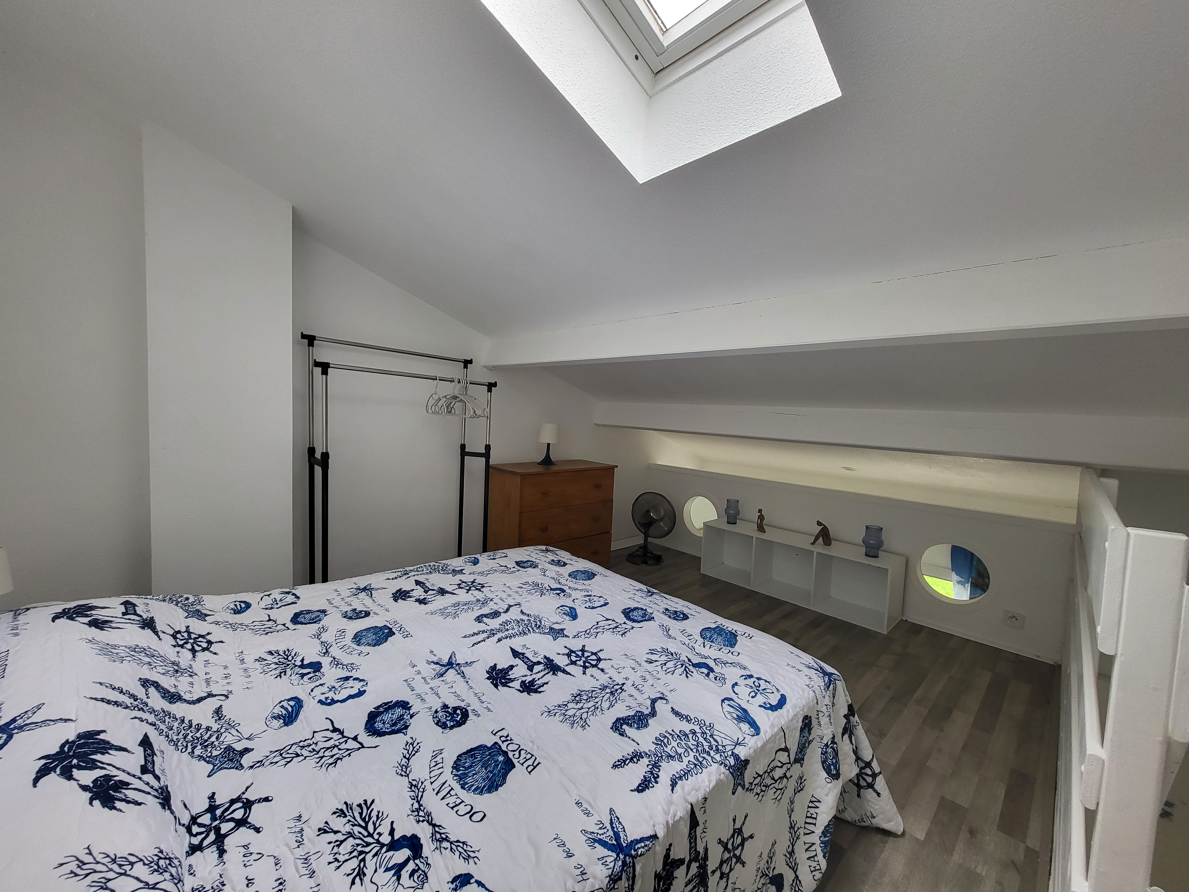 À l’étage, une mezzanine accueille un second lit double (140x190) pour des nuits confortables.