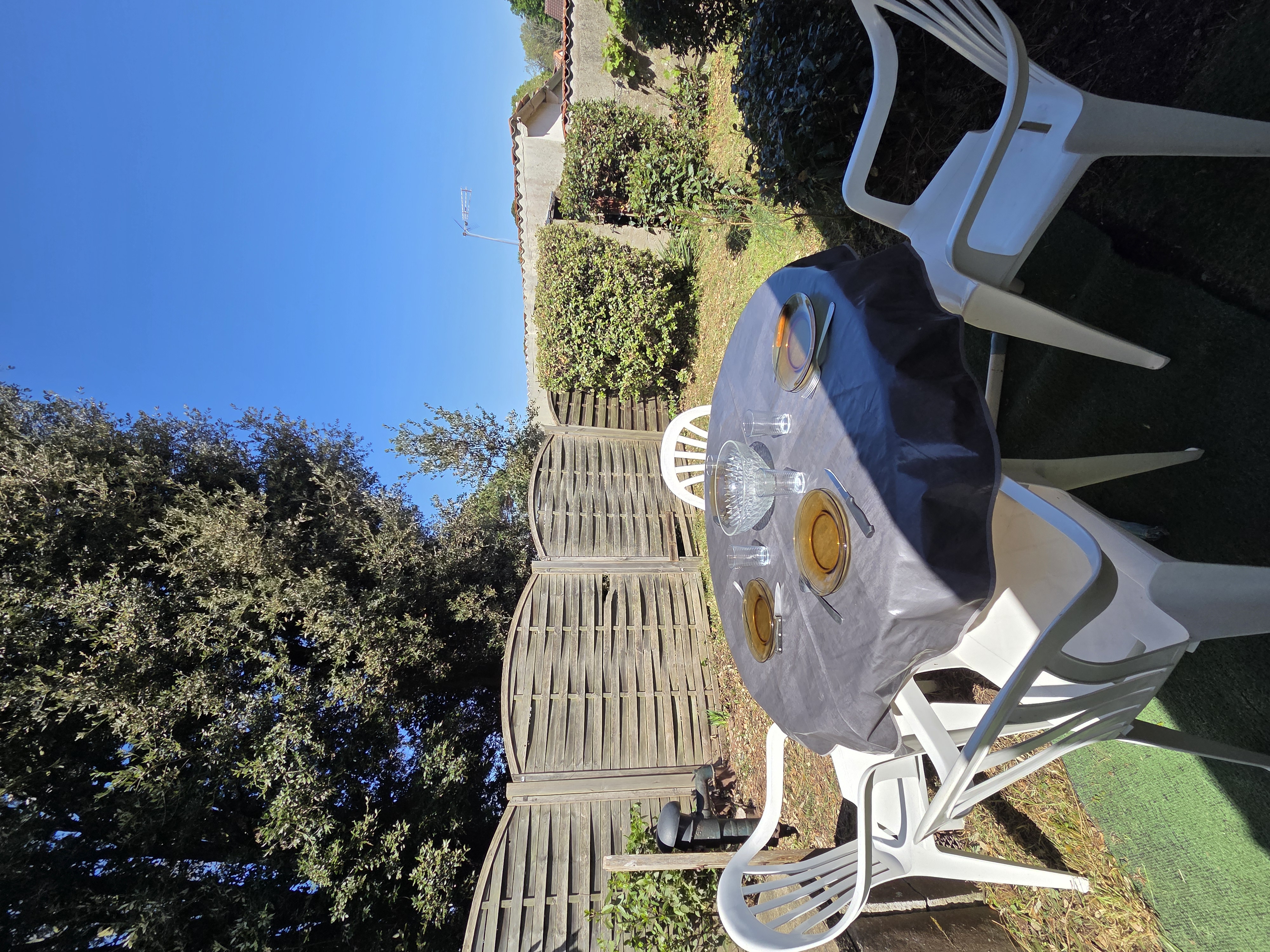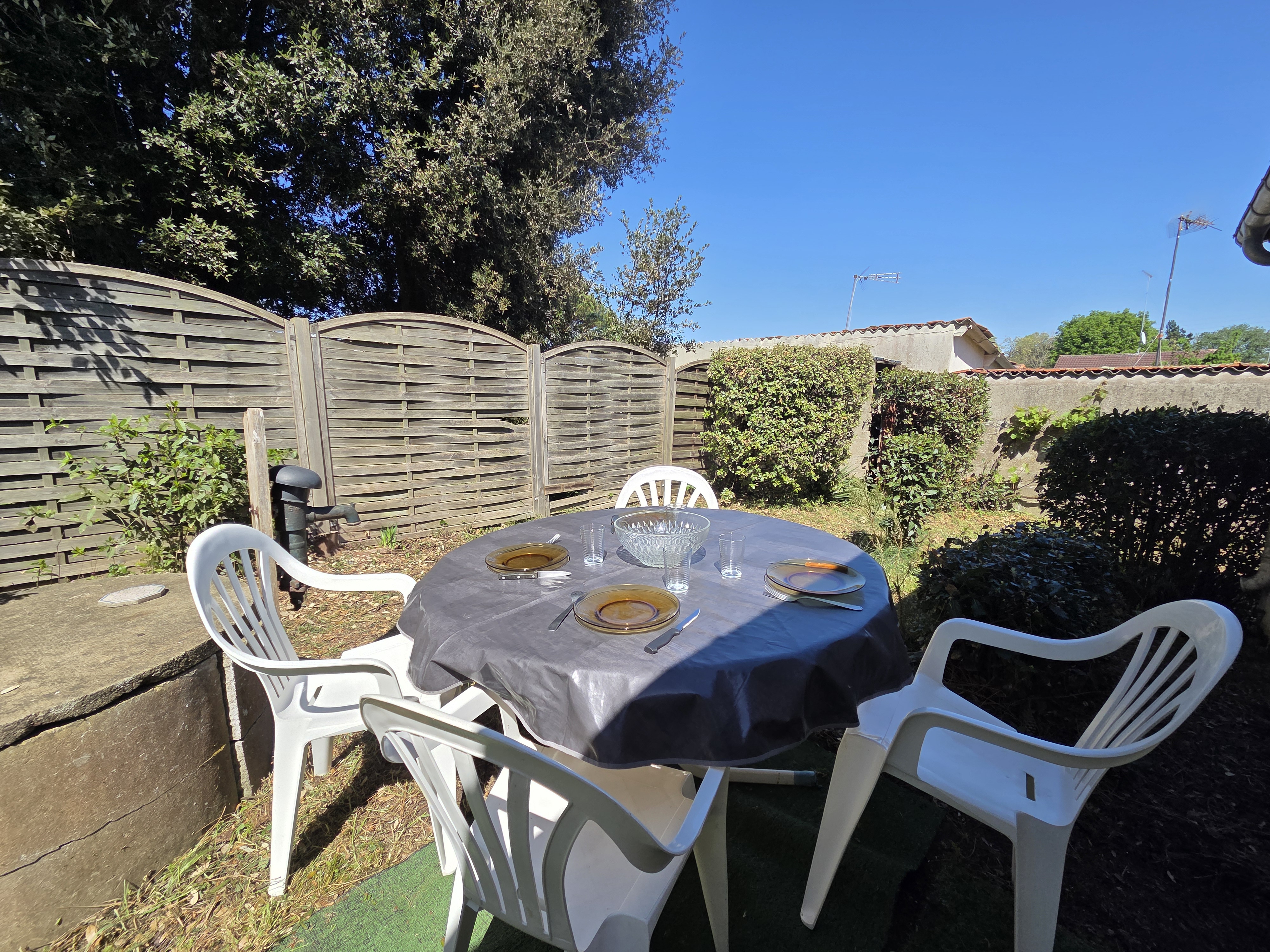 À l'extérieur, le terrain de 300 m², recouvert de sable, est agrémenté d'un chalet en bois pour le rangement, d'un salon de jardin et d'un barbecue, idéal pour profiter du soleil. Une entrée pour voiture est également disponible. Deux vélos sont mis à disposition pour vos déplacements.