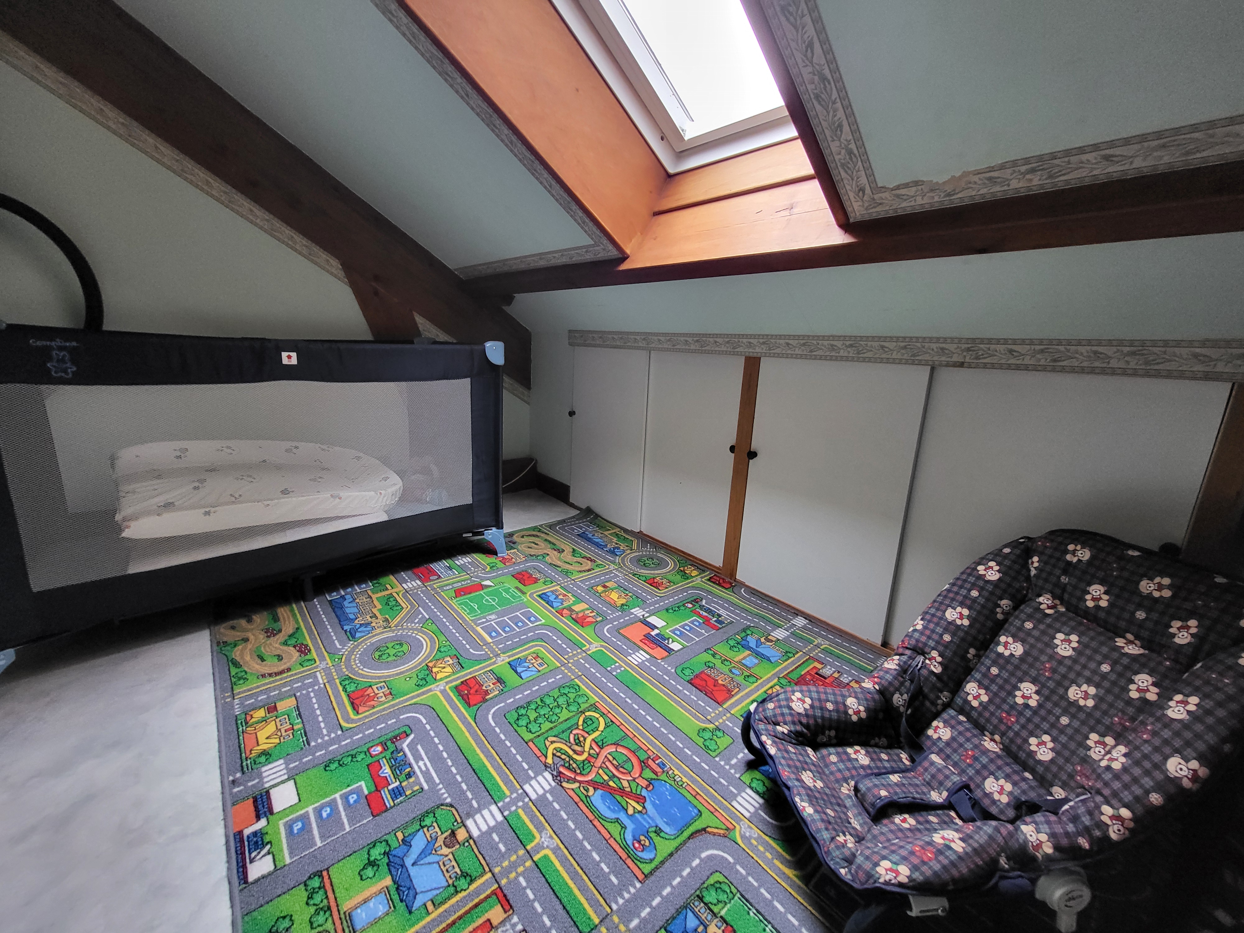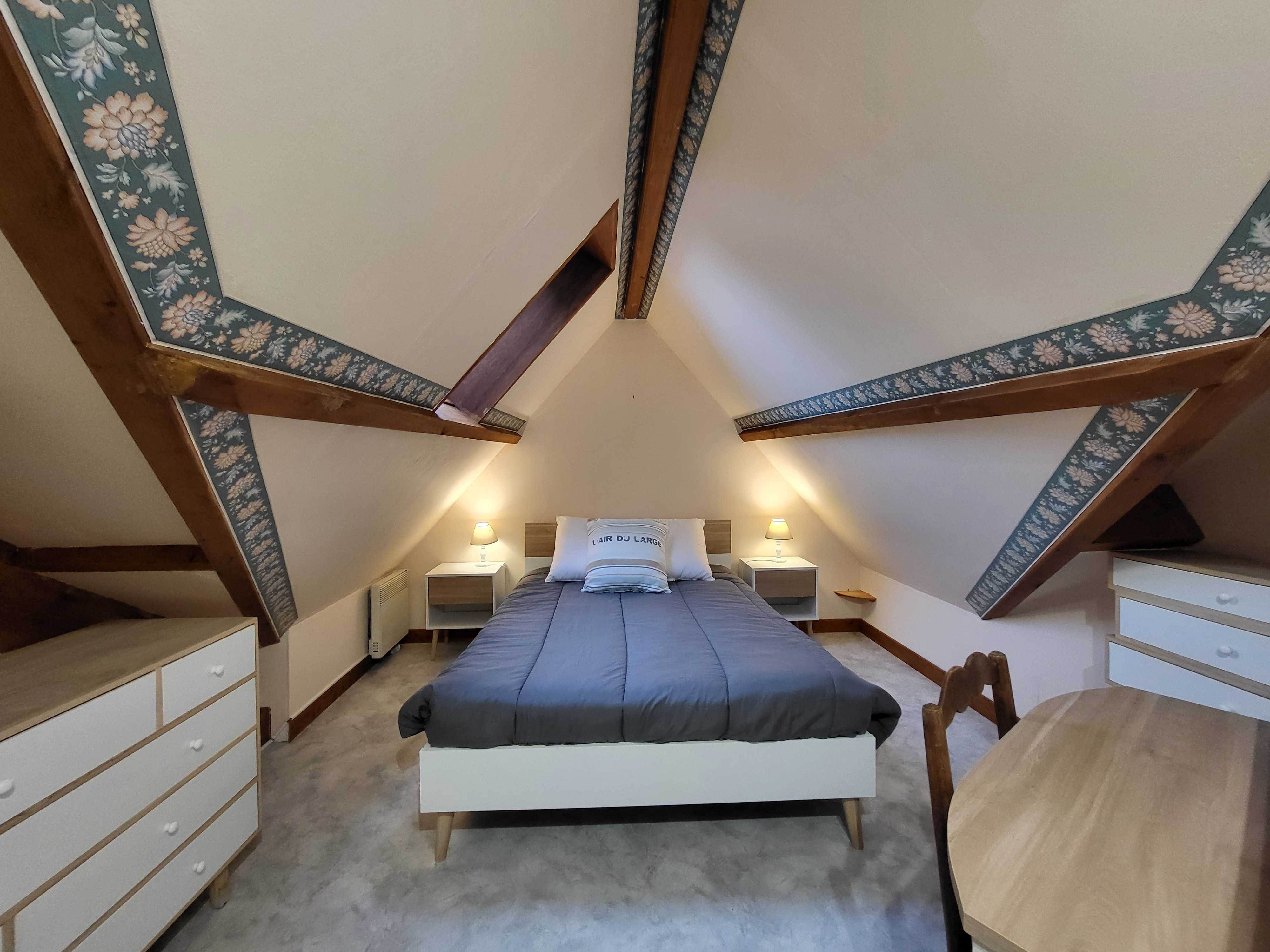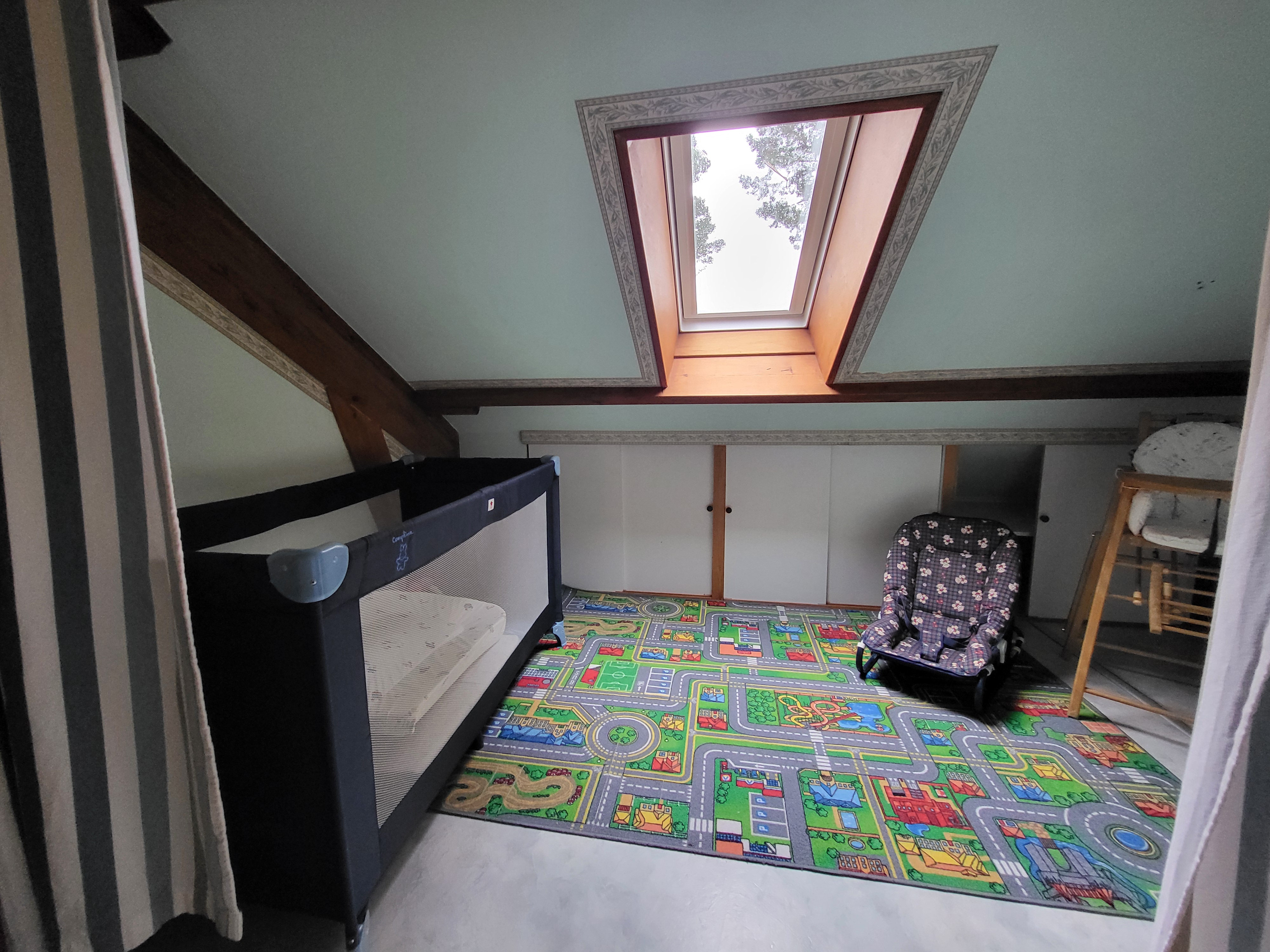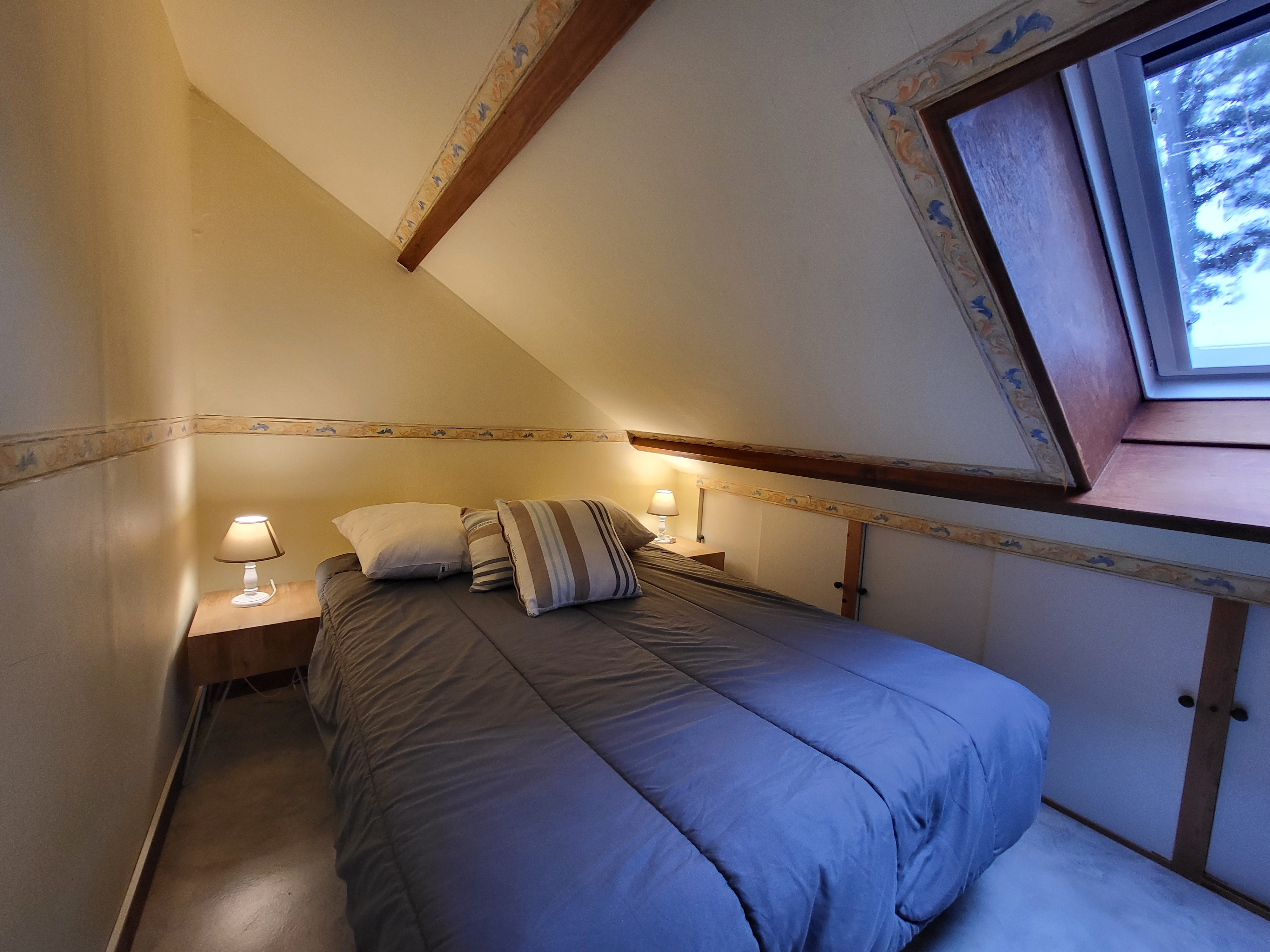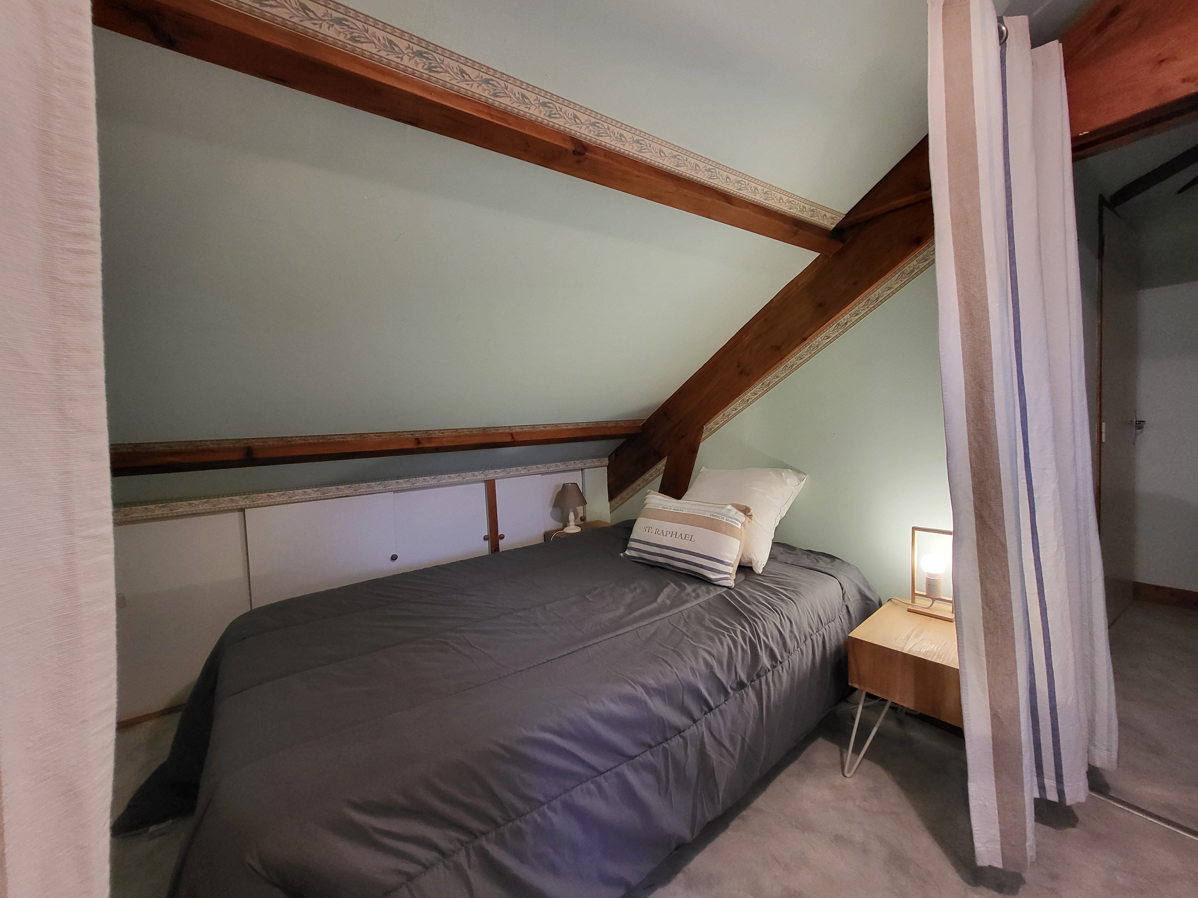 À l’étage, l’espace nuit comprend un lit une personne (120x190 cm) et un coin bébé séparé par un rideau, tandis que deux autres couchages (lit 140x190 cm) sont isolés par une porte pour plus d’intimité. Un second WC avec lavabo complète cet étage.