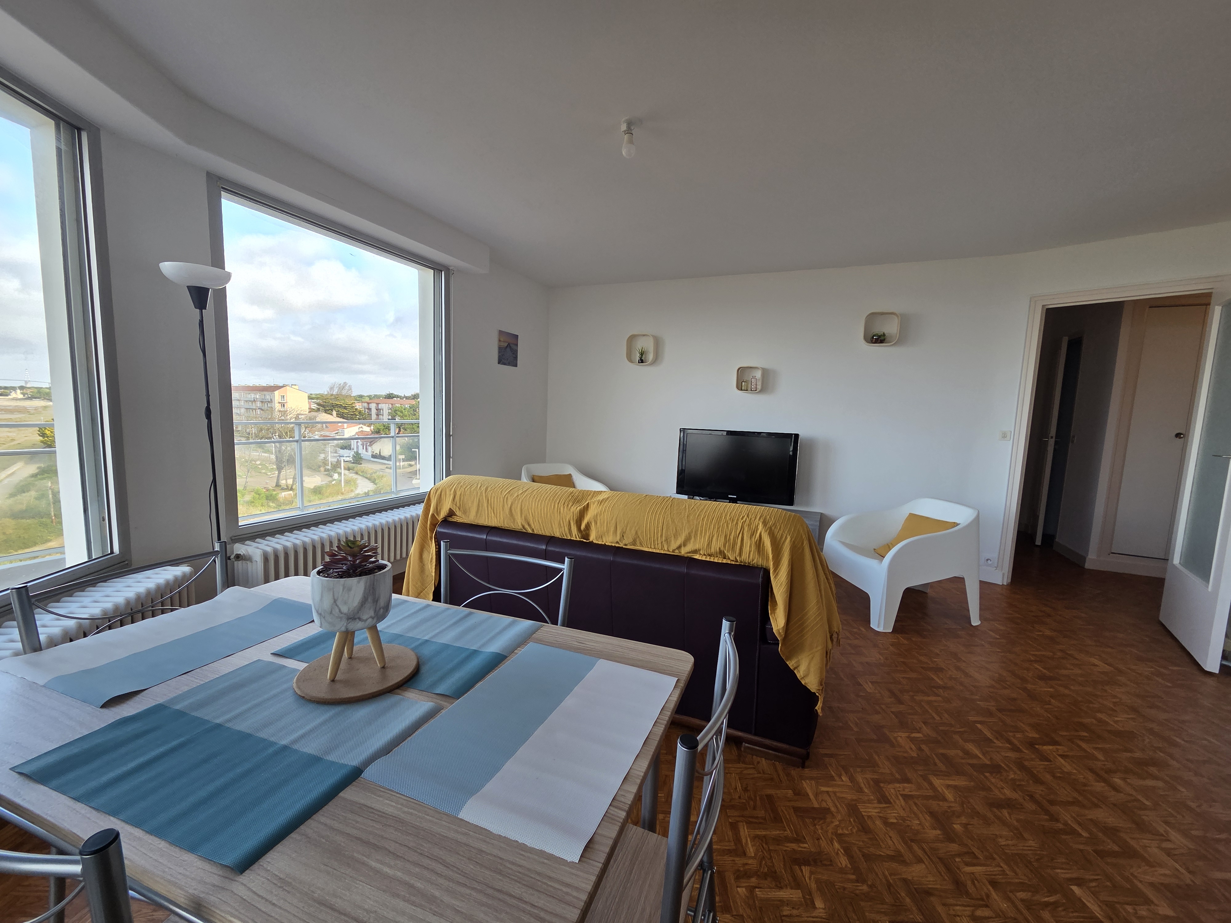 -Chambre principale avec lit double (160 cm) et accès direct à la terrasse offrant vue sur le boulevard Padioleau et la mer.