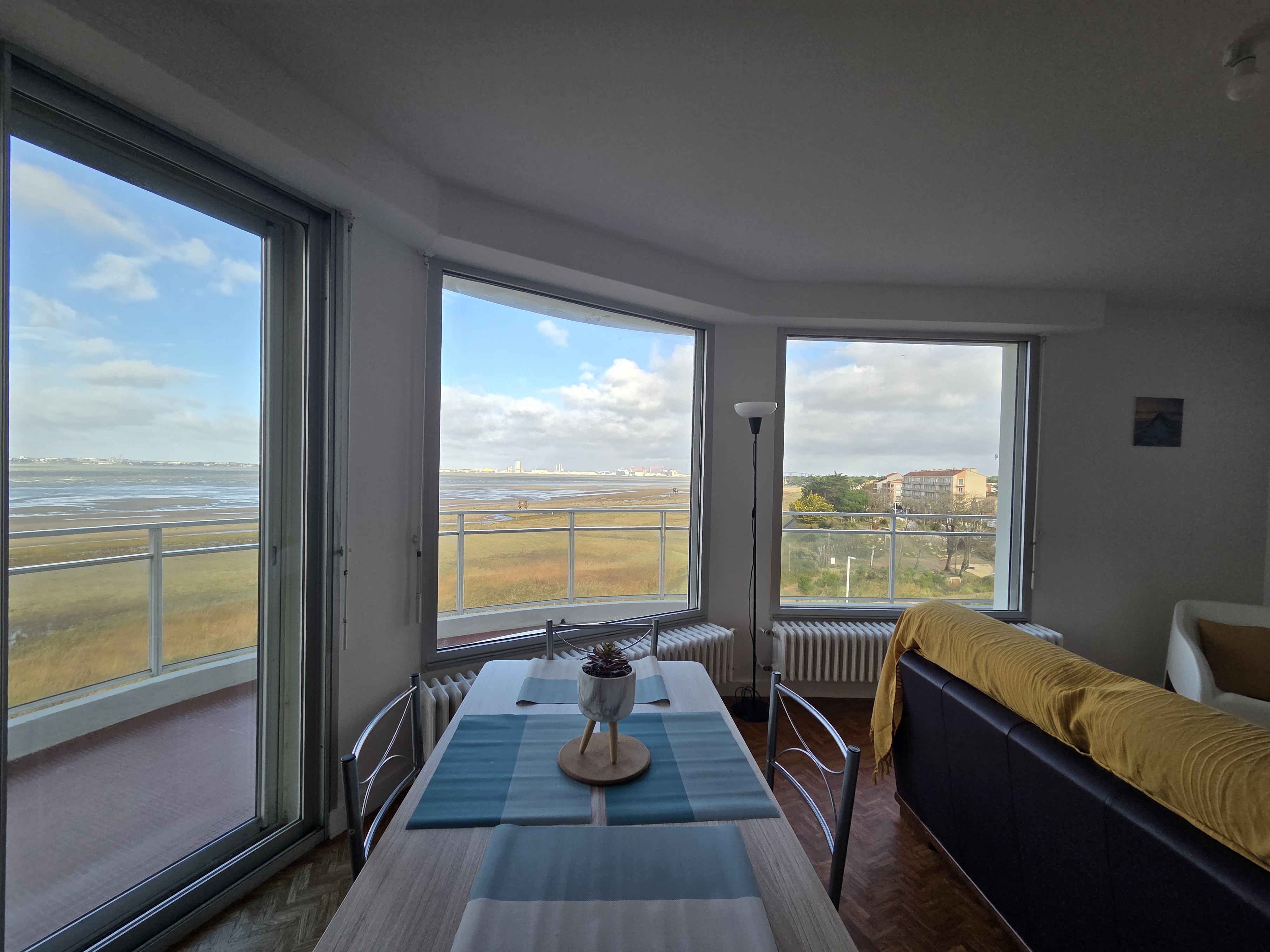 -Salon-séjour lumineux avec canapé, TV et table à manger, donnant accès aux terrasses avec vue panoramique sur la mer et sur Saint-Nazaire.