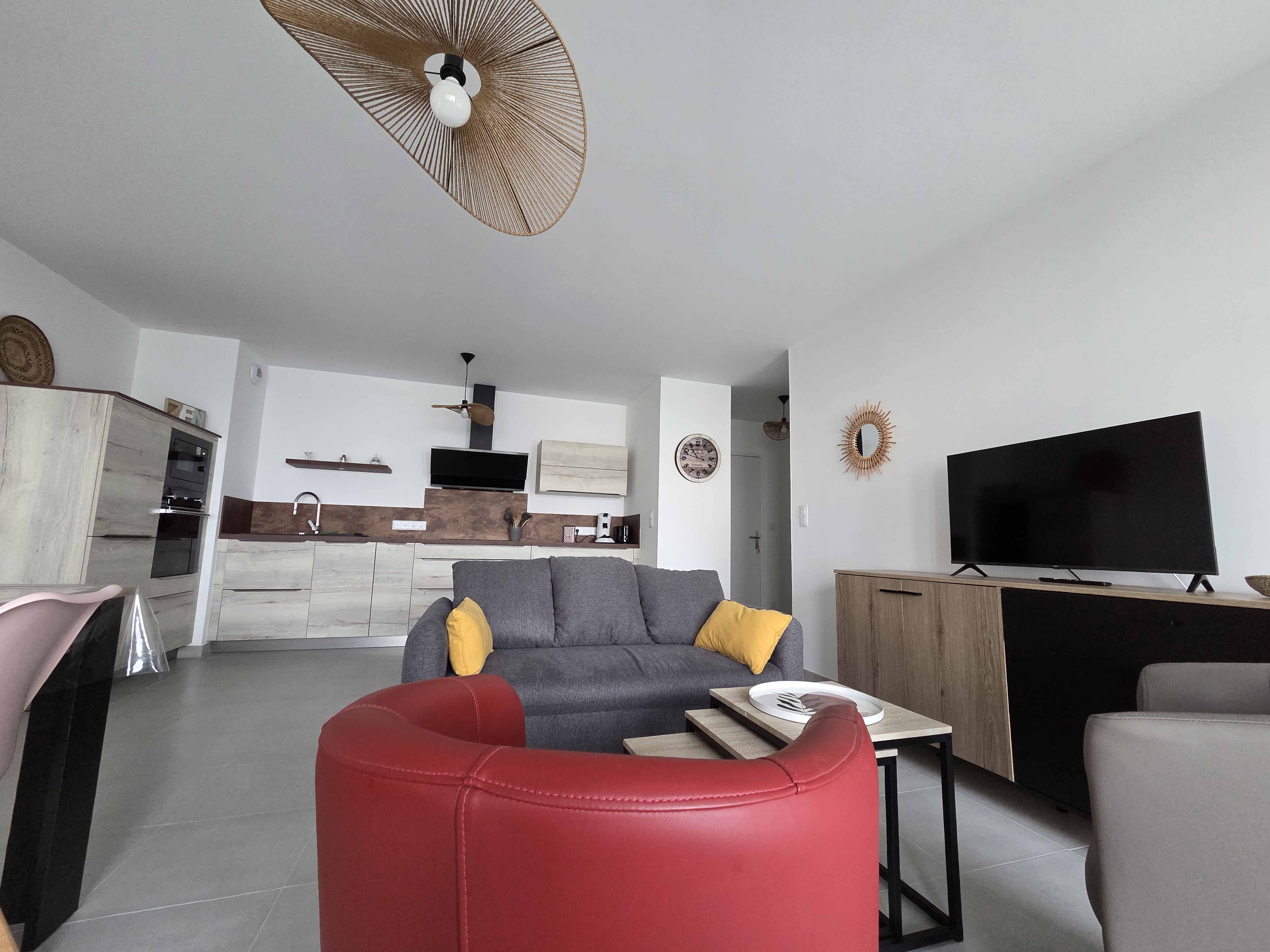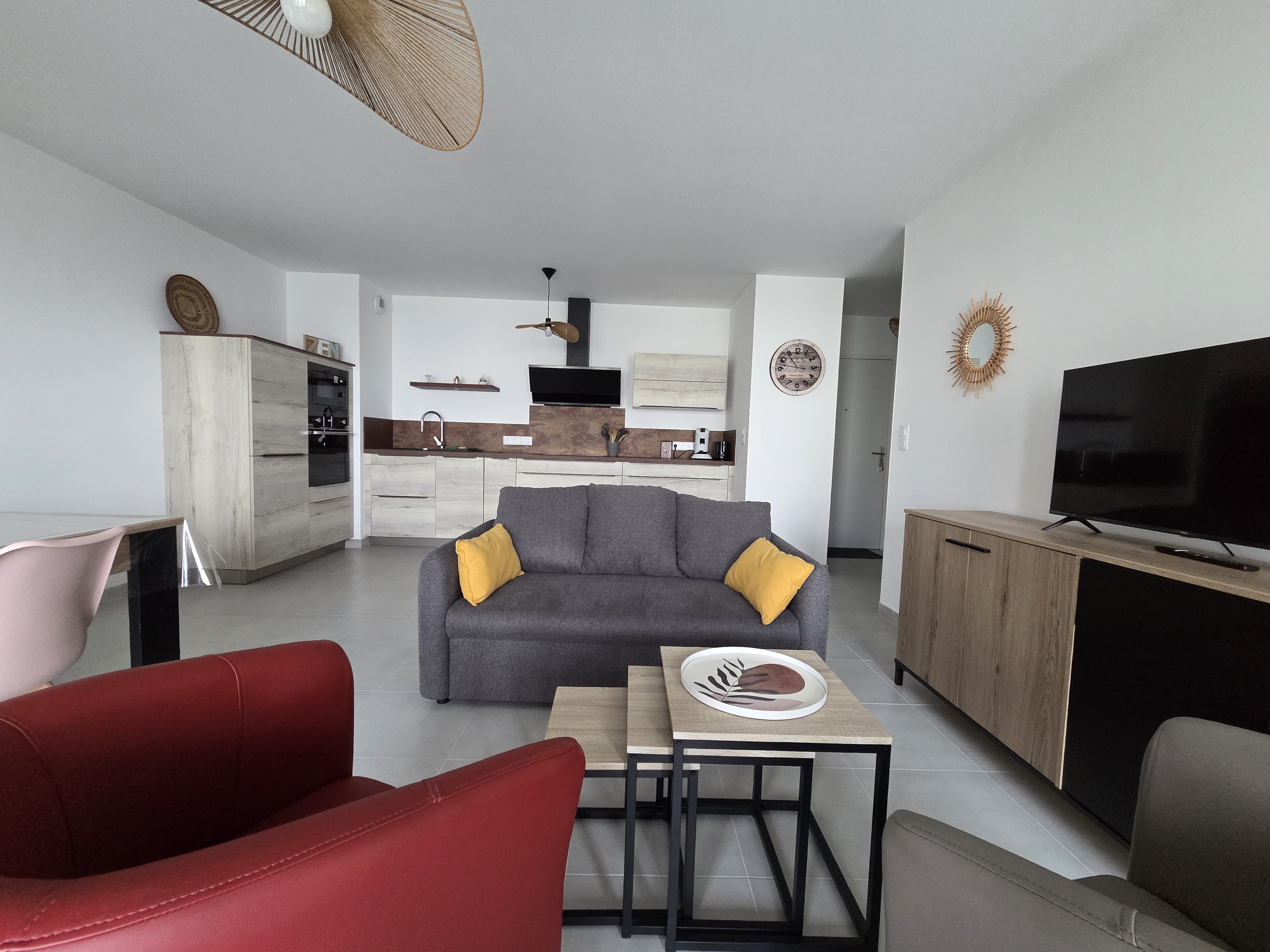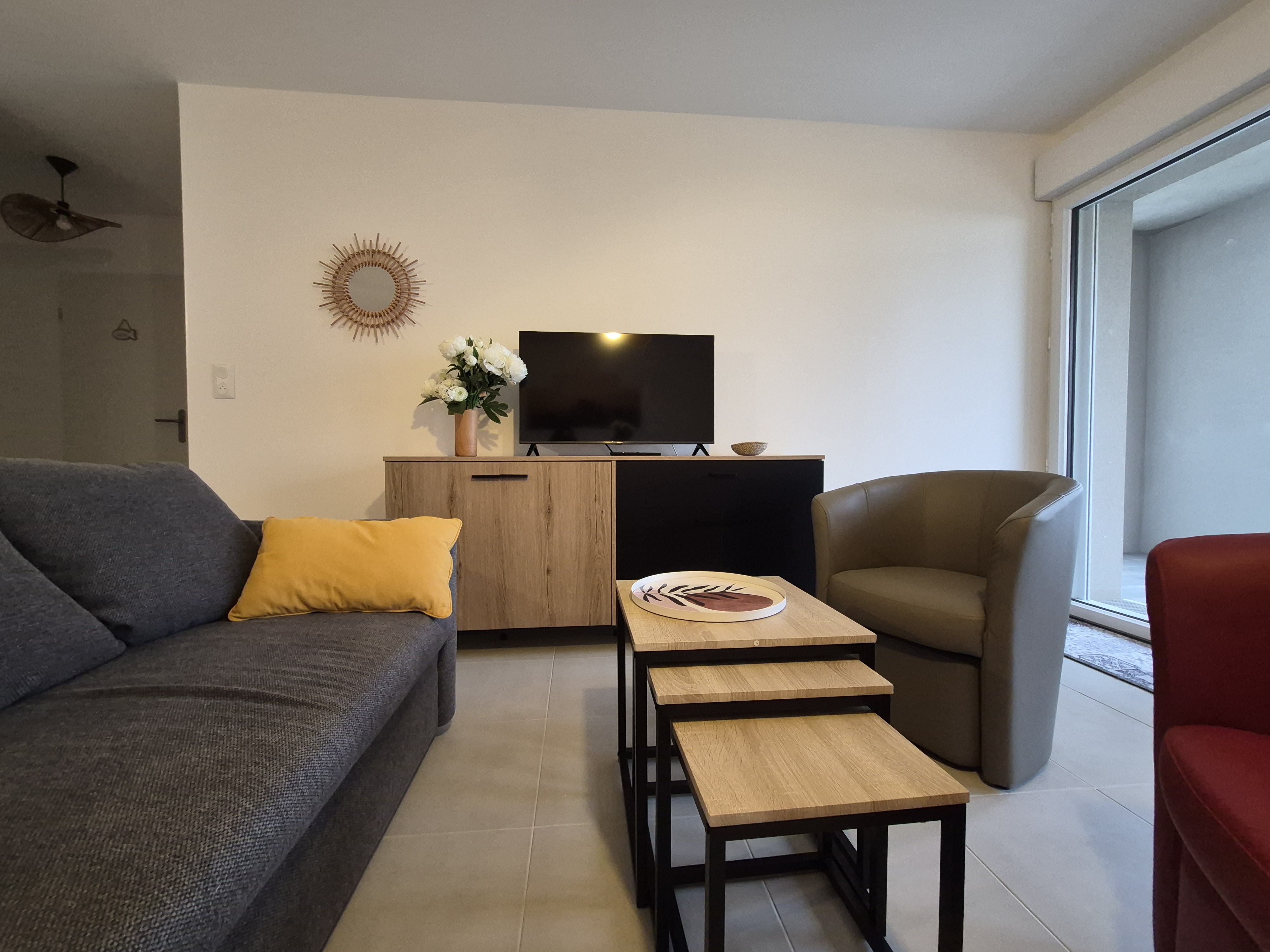 -Séjour lumineux équipé d’une télévision, ouvert sur la terrasse, idéale pour vos moments de détente.