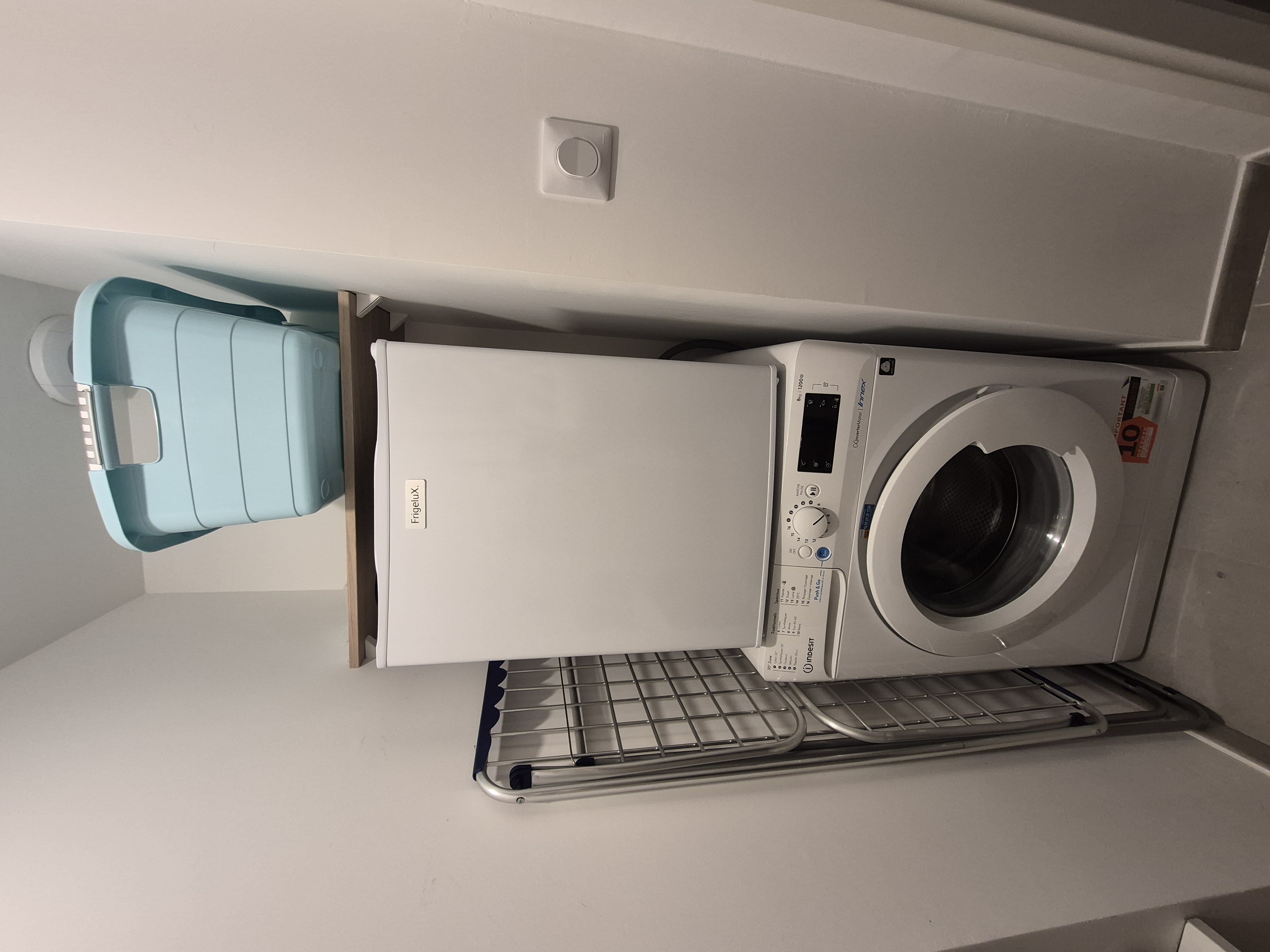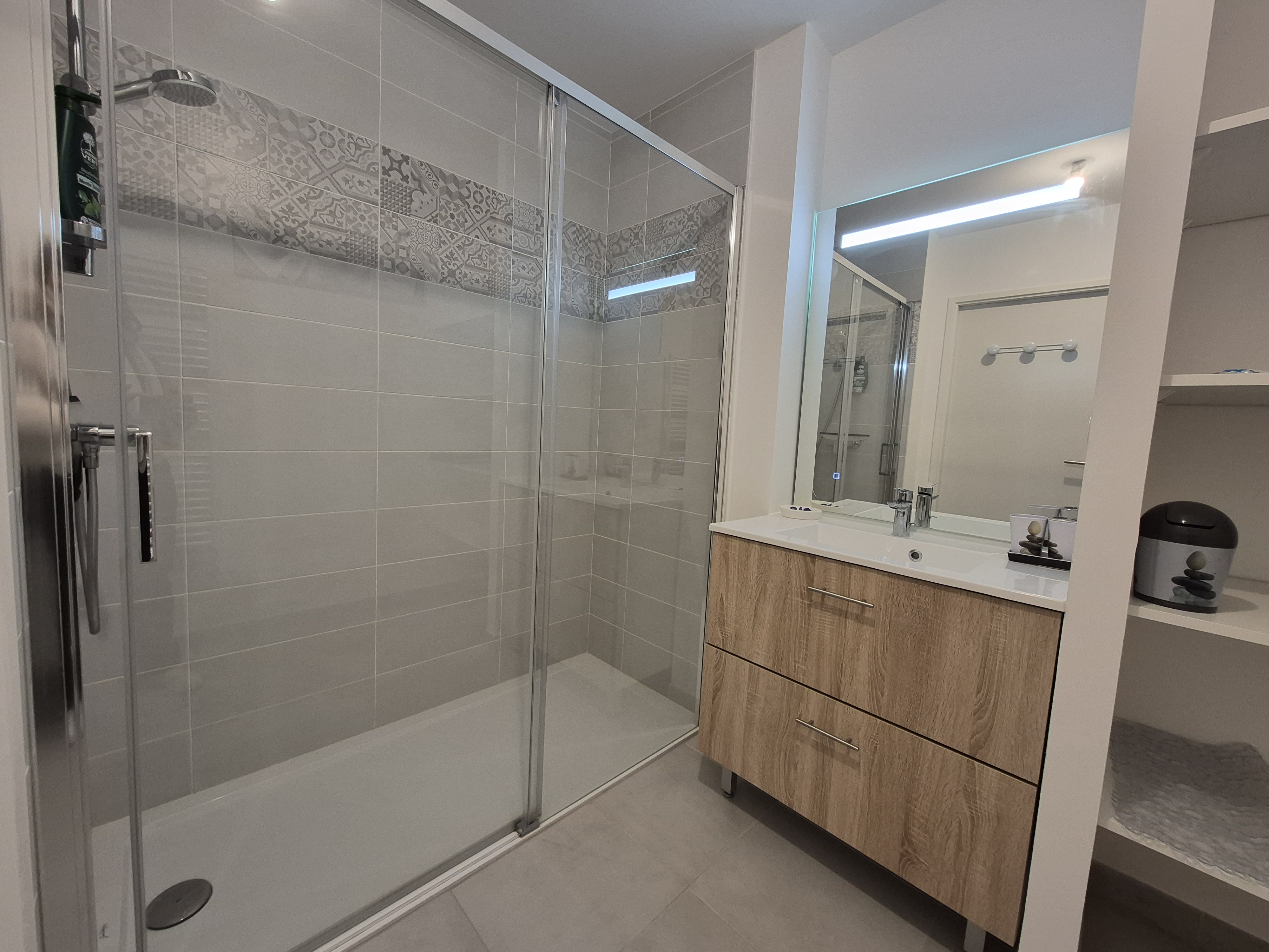 -Salle d’eau moderne avec douche, sèche-cheveux et lave-linge.
