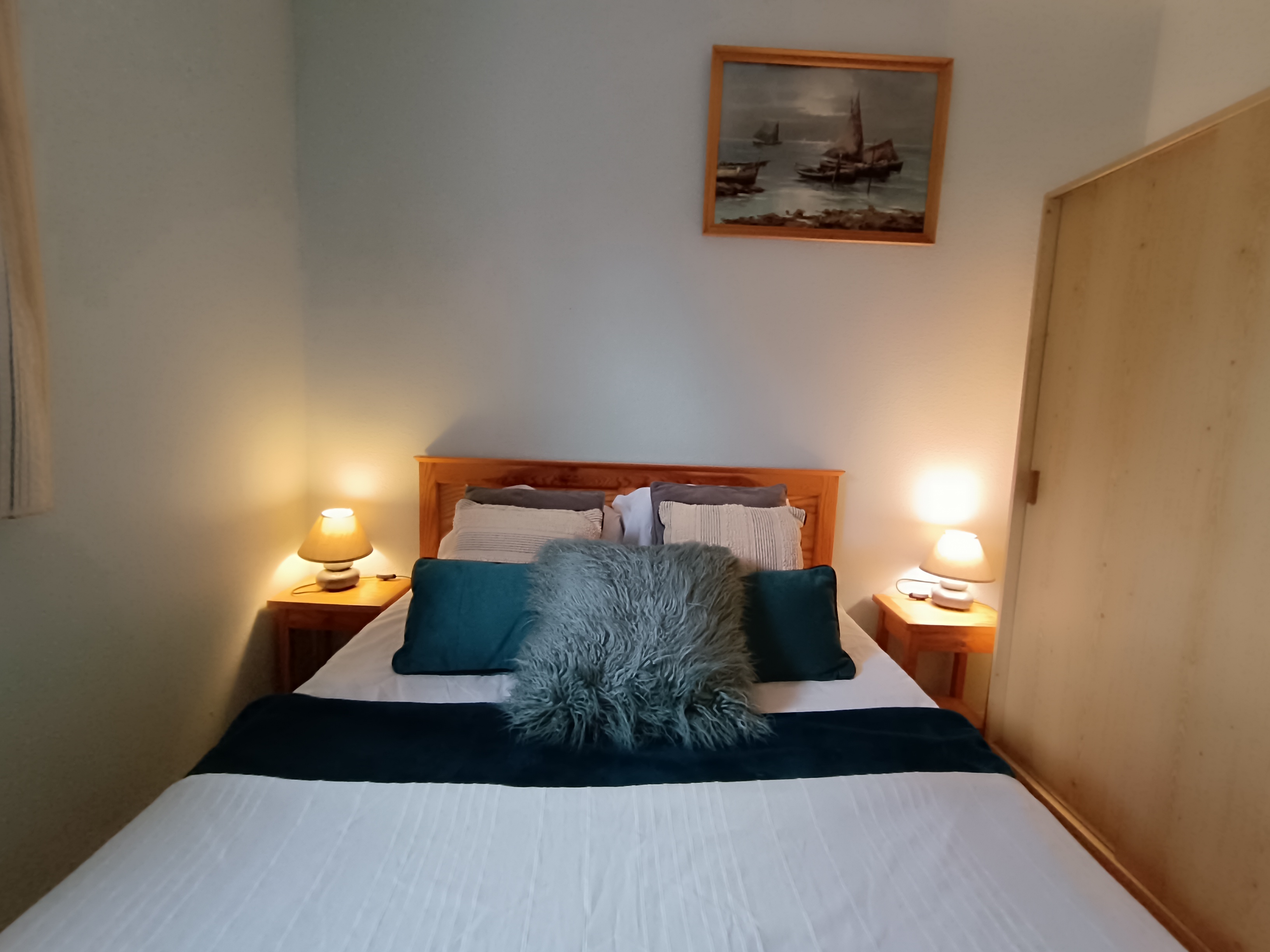 La chambre est équipée d’un lit double (140 cm), et la salle d’eau dispose d’une douche cabine, d’un meuble vasque et de WC. Un placard-penderie permet de ranger vos affaires facilement.