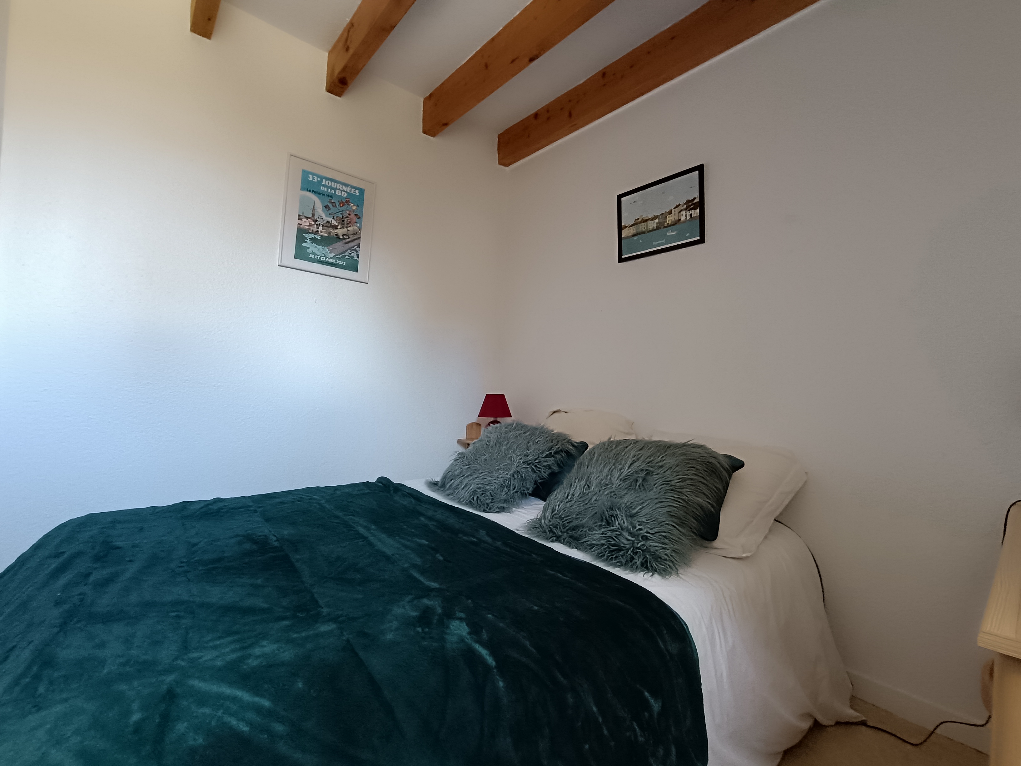 -Étage : seconde chambre de 6,39 m² avec salle de bains et grand placard intégré.